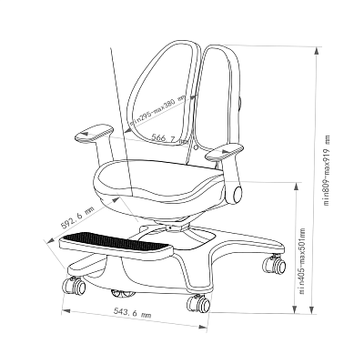 Кресло имеет размеры 544х593 мм, что позволяет разместить его даже в небольших помещениях. Регулировка высоты сиденья (400-500 мм) и кресла (810-920 мм) позволяет адаптировать кресло под рост ребенка, обеспечивая правильное положение спины и комфорт во время использования.
