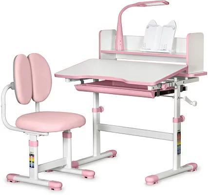 Высота столика изменяется механизмом плавной регулировки специальной ручкой, позволяющей с легкостью устанавливать парту в соответствии с ростом ребенка. Кресло регулируется по высоте и фиксируется винтами. На мощных металлических ножках есть мебельные опоры, помогающие установить комплект на неровных поверхностях.
