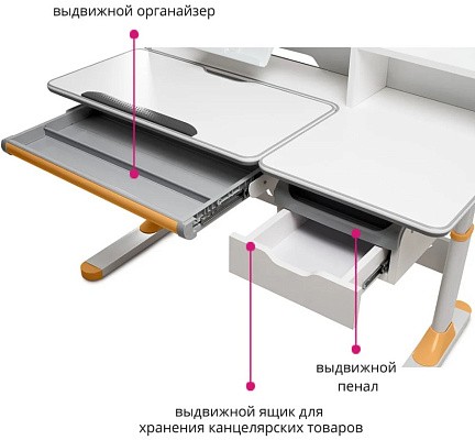 Вместительная надстройка в совокупности с тремя выдвижными ящиками, позволяет хранить все принадлежности для обучения в одном месте. Два из трех ящиков имеют секционное разделение, для комфортного хранения карандашей, ручек и прочей мелкой канцелярии.