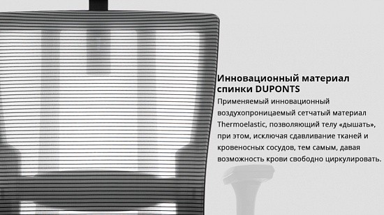 Основной конструктивной особенностью эргономичного кресла DuoFlex Mesh является применяемый инновационный эластичный, воздухопроницаемый сетчатый материал Thermoelastic, позволяющий телу «дышать», при этом, исключая сдавливание тканей и кровеносных сосудов, тем самым, давая возможность крови свободно циркулировать.