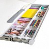Под столешницей размещен большой выдвижной органайзер, созданный из прочного, безопасного пластика. Органайзер состоит из двух отделов. Один – для хранения тетрадей, альбомов, второй, поменьше, для канцелярских принадлежностей.